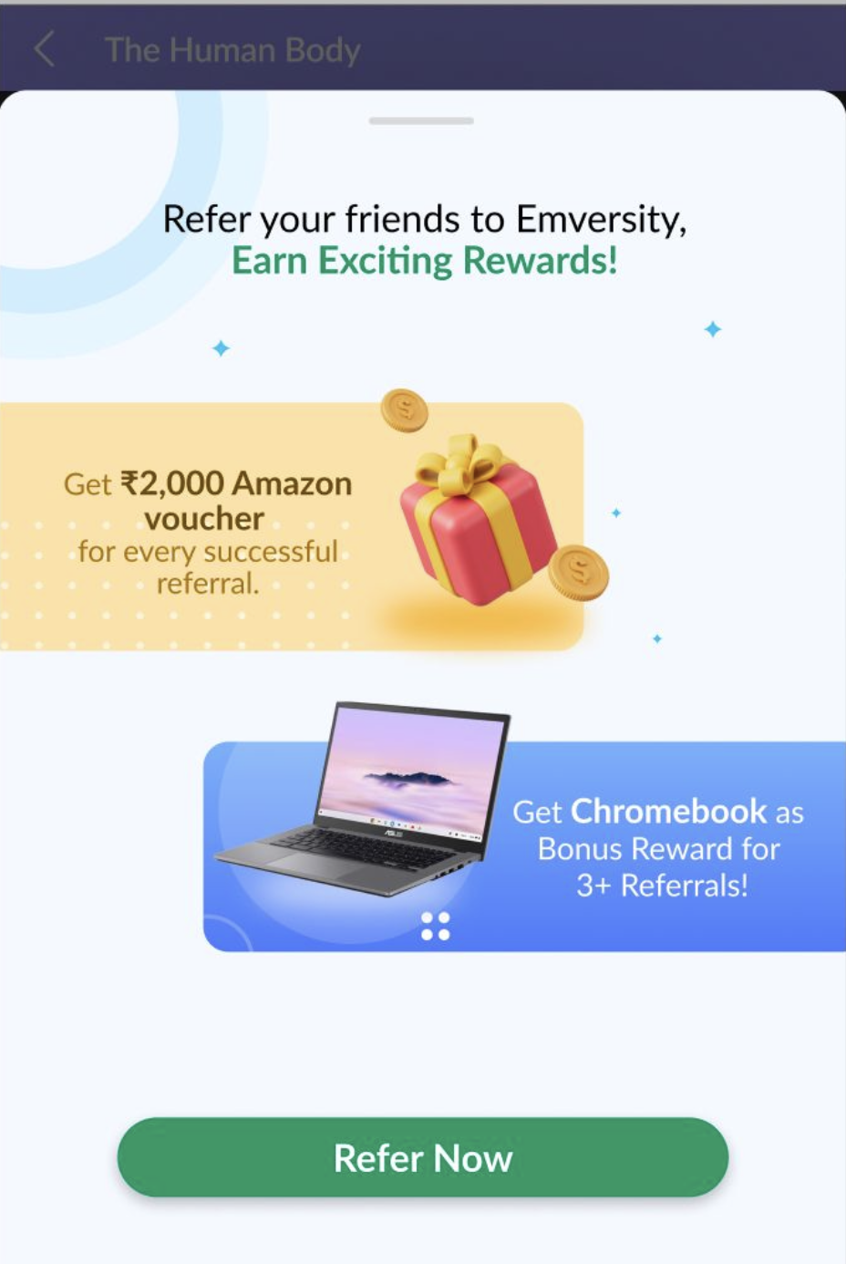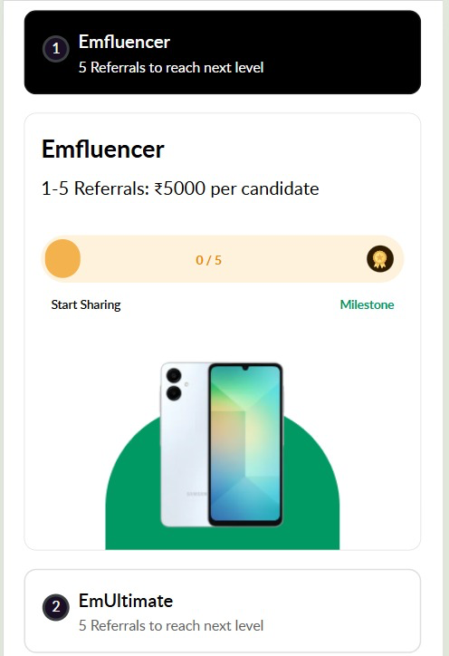Built two parallel referral engines: (1) CRM-driven for ISTs — Referral Form in LSQ, auto-assign, unique codes, ₹2K per referral, 3 referrals/IST/day target. (2) Product-driven for students — Refer & Earn in LMS/ERP, gamified tiers (EmFluencer/EmUltimate/EmBassador), Chromebook for 3+ referrals.